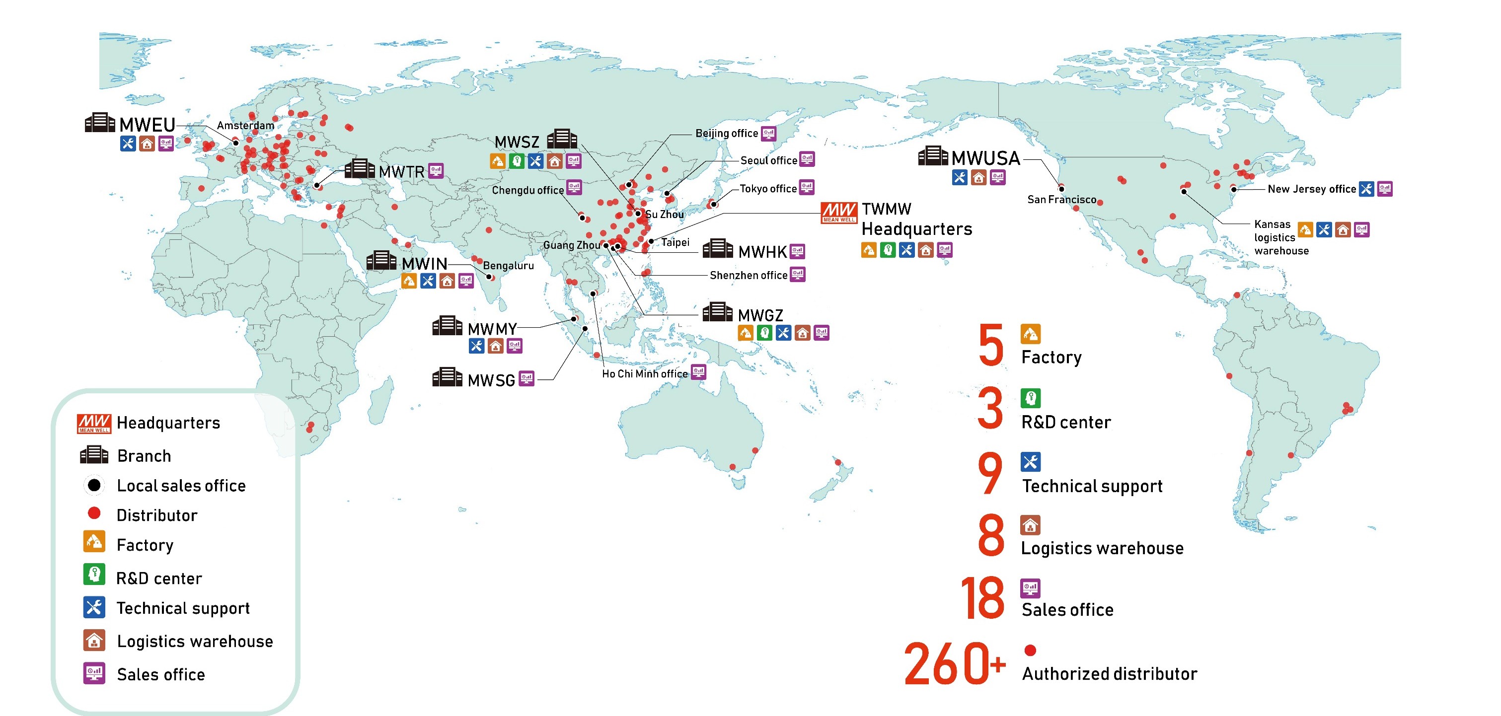 明纬公司成立于西元1982年,是标准电源供应器领导品牌。在全球电源(DC output)制造商排名中名列第五 (2025 MTC report),于全球LED电源驱动器市场排行第二 (2017 IHS report),是以自有品牌—MEAN WELL为主要营运策略的电源厂。 2024年已成为合并营收达10.5亿美金以上的专业电源品牌制造商,全球总部位于台湾新北产业园区,在中国广州、深圳、苏州、美国加州、欧洲荷兰、亚洲土耳其、新加坡、马来西亚及印度分别设有分公司及办事处,全球员工人数达2335人。目前拥有5座生产基地,分别位于台湾新北市、广州花都区、苏州市相城区 、美国堪萨斯城以及印度邦加罗尔。